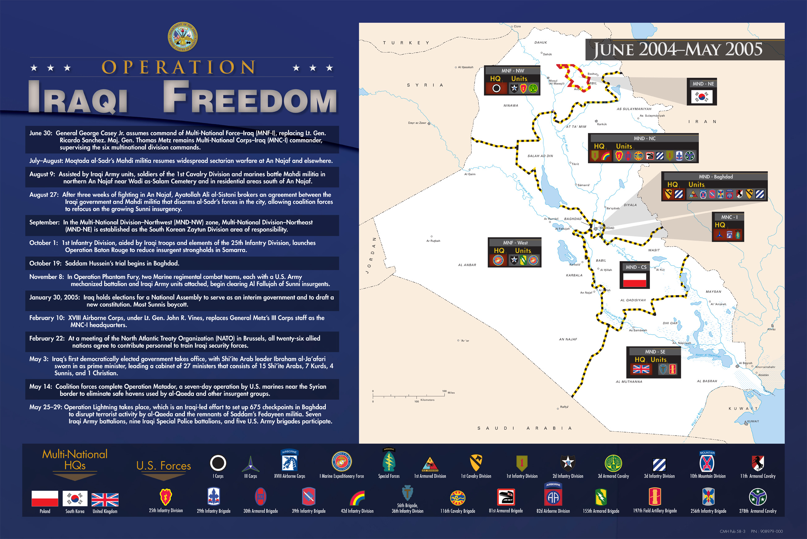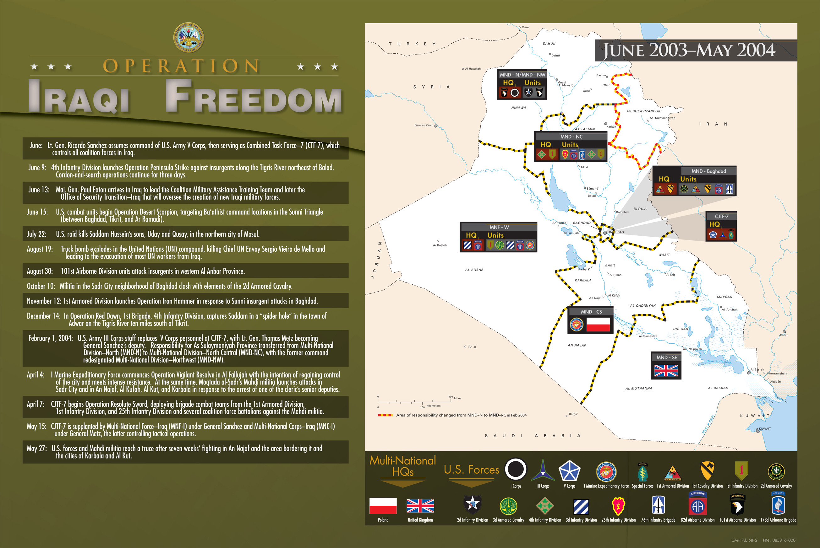 This striking poster (24" by 36") depicts the combat operations of and major unit involvement in Operation Iraqi Freedom from June, 2003 to May, 2004. Complementing an attractive color map and relevant illustrations is a chronology that explains the major events during the time period and provides context to the action shown on the map.