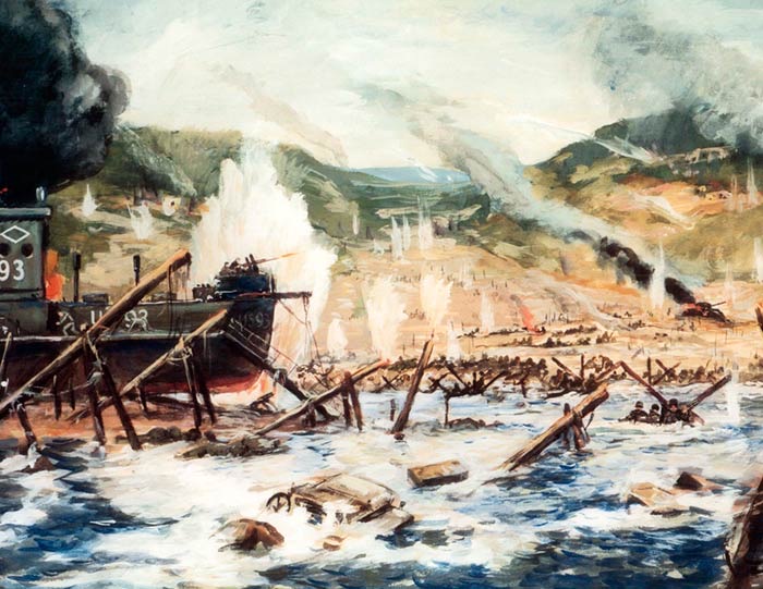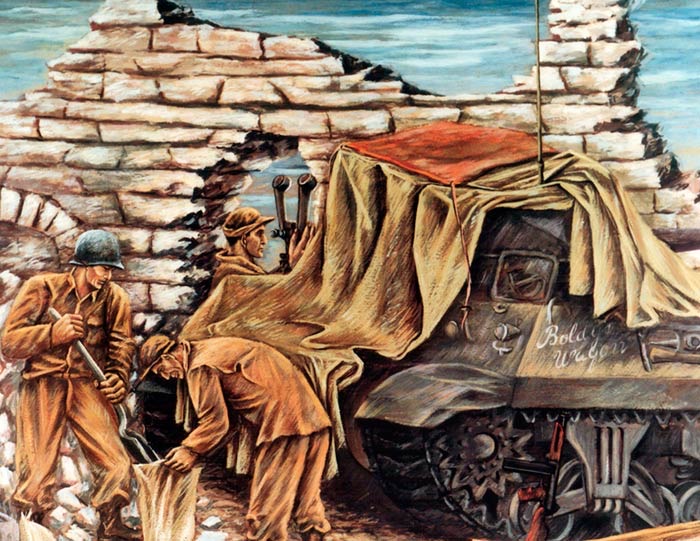 By 1944 the Allies were in control of the situation in all theaters of war. Active offensive campaigns were under way which would eventually lead to complete success against both Germany and Japan. These reproductions from the Army Art Collection portray some of the wide variety of the Army's activities during the middle years of World War II as the Allied Powers began to turn the tide of aggression around the world.